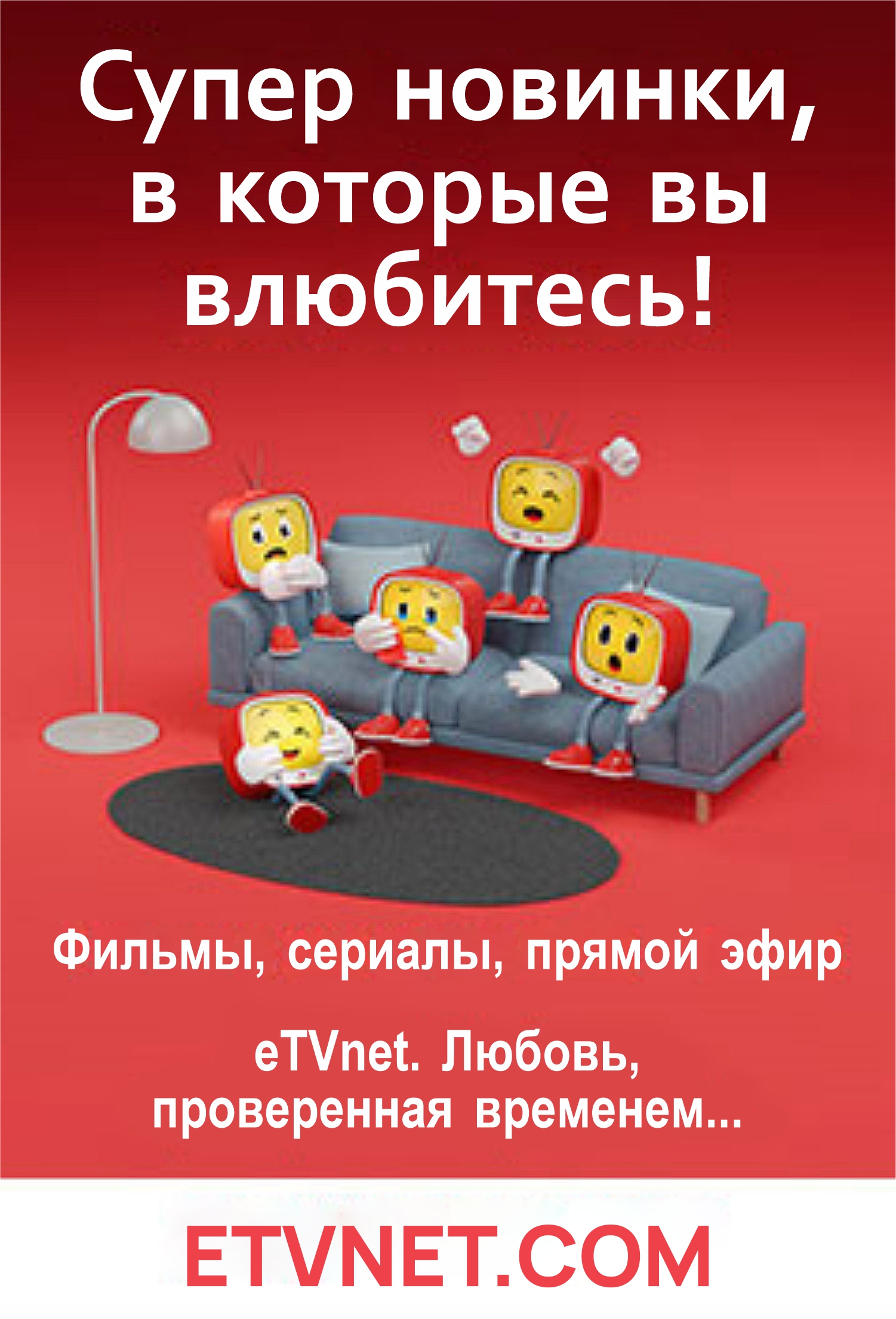 Всего несколько кликов – и в твоем распоряжении лучший развлекательный сервис на родном языке! Самые популярные сериалы, блокбастеры проката, новинки сезона и знаковые кинопремьеры – на eTVnet можно найти самые востребованные фильмы и передачи. Любишь комедии, боевики, мелодрамы? У нас можно найти лучшие фильмы в любом жанре, концерты, юмор и спортивные передачи! Родителям маленьких детей не придется больше думать, что включить малышам. Такого выбора мультиков и познавательных передач нет больше нигде! С детьми постарше можно посмотреть фильмы для семейного просмотра и приобщить их к классике детства или наследию мирового кинематографа. Все это богатство выбора доступно зрителям eTVnet для просмотра из архива в любое время и без рекламы! Что может быть удобней?