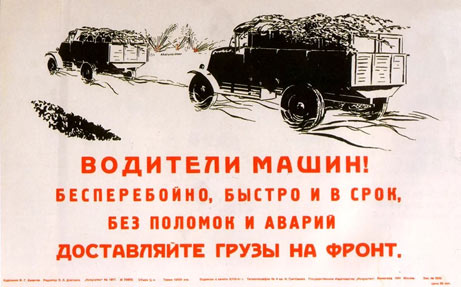 Советский плакат времён Отечественной войны: «Водители машин! Бесперебойно, быстро и в срок, без поломок и аварий доставляйте грузы на фронт»