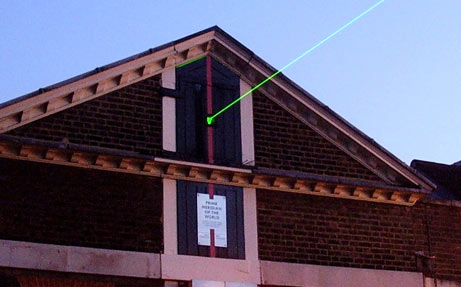 Из круглого отверстия в мансарде одного из зданий Гринвичской обсерватории бьёт зелёный луч лазера, направленный строго на север, - это и есть нулевой меридиан