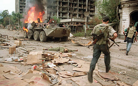 Первая чеченская война. Убитый солдат и подбитый бронетранспортёр на улице Грозного