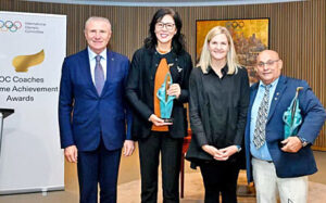 Президент МОК Kirsty Coventry и председатель комиссии МОК Сергей Бубка на церемонии, которая прошла в Олимпийском доме в Лозанне, Швейцария, вручили награды Международного олимпийского комитета тренеру по волейболу Lang Ping (Китай) и тренеру по борьбе Raúl de Jesús Trujillo Díaz (Куба)