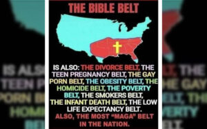 На второй популярной в США карте изображена истинная цена морали, с которой они, эти святоши, так носятся, которой кичатся. Там написано, что библейский пояс это также пояс разводов, подростковой беременности, мужской порнографии, пояс ожирения, убийств, нищеты, курения, детской смертности, низкой продолжительности жизни и, наконец, пояс MAGA! И так оно и есть, по всем этим параметрам южные штаты лидируют.