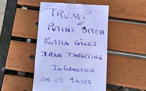 Ибо на скамейке под магазином увидел антитрамповскую листовку, приклеенную скотчем: «Трамп – сука Путина. Россия передает Ирану информацию о целях на американских базах». Не в первый раз такую увидел. В нашем округе Сен-Джонс вдвое больше республиканцев, чем демократов, причем «респы» в основном колерованные трамписты, агрессивные, вот и приходится «демам» вести подпольную пропаганду.