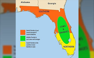 На шуточной карте Флориды ее южная часть обозначена как северная, как самый южный из северных штатов, а северная (я тут живу уже 10 лет) как южная, как юг Алабамы и Джорджии. Ну, а центр подписан просто: коровы и апельсины. То есть север относится к т.н. «bible belt», библейскому поясу, месту концентрации христиан-евангелистов, приверженцам библейской морали.