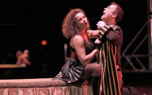 Продолжаем о любви. Театральная компания Les Ecornifleuses предлагает ужаснуться плодам, созревшим в ее лучах. Впрочем, известный шекспировед Александр Абрамович Аникст, который инвентаризировал потери в первой трагедии Шекспира «Тит Андроник» (14 убийств, 34 трупа — включая останки 20 возвращенных домой погибших воинов, 3 отрубленные руки, 1 отрезанный язык), причиной сумасшедших и неубедительно мотивированных событий считает месть. Что не совсем верно. С одной стороны, старший сын плененной готской королевы Таморы, как ни умоляла та о милосердии, действительно принесен в жертву павшим римлянам. Поначалу в присутствии убитой горем матери подробно обсудили процесс: «Мечами будем тело на костре/ Рубить, пока не обратится в пепел». А после не преминули живописать результат: «…изрублен/ И внутренности брошены в огонь» (перевод А. Курошевой). С другой — возможность отомстить отдавшему этот приказ Титу появилась у Таморы только потому, что в нее до помешательства влюбился цезарь Сатурнин. До того, что разделил с чужестранкою трон.