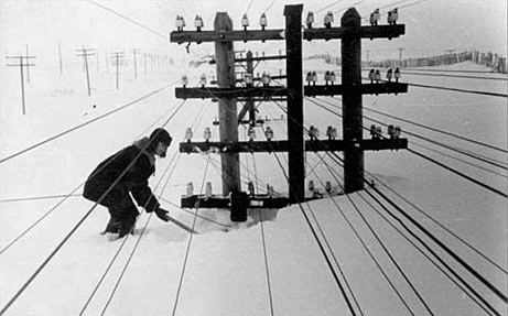Сибирь. Прошёл снегопад, и слегка засыпал столбы с проводами
