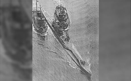 Сдавшуюся немецкую субмарину «U-234» два буксира ведут к причалу в американский порт