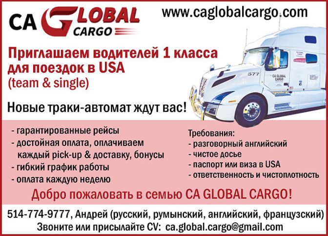 Звоните или присылайте CV: ca.global.cargo@gmail.com